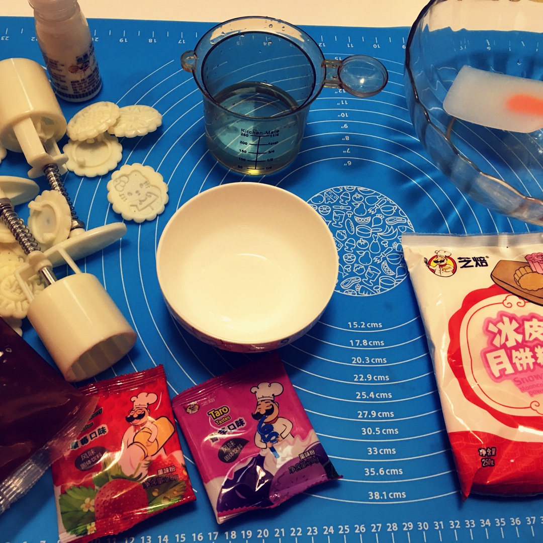 备品:月饼模 白油 冰皮月饼粉 果味粉(只买到了草莓和香芋) 水(据说可以用牛奶或椰奶)馅儿 (我用的木糖醇的伍仁和金桔...