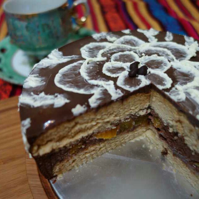 巧克力咖啡黄桃,慕斯加戚风蛋糕,偏苦适合我口味~可惜花画的有点样衰就这样…… #wenty...