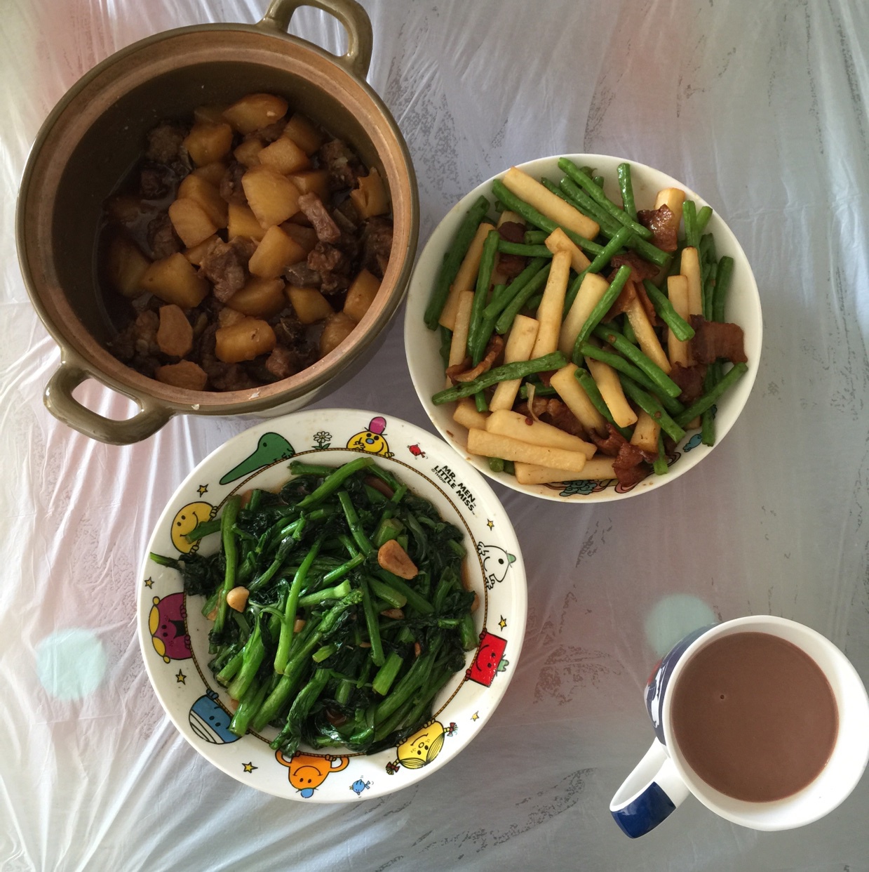 和儿子的午餐,三菜一汤[排骨焖薯仔、豆角山药炒五花肉、蒜蓉炒菜心]全部清光(^O^)