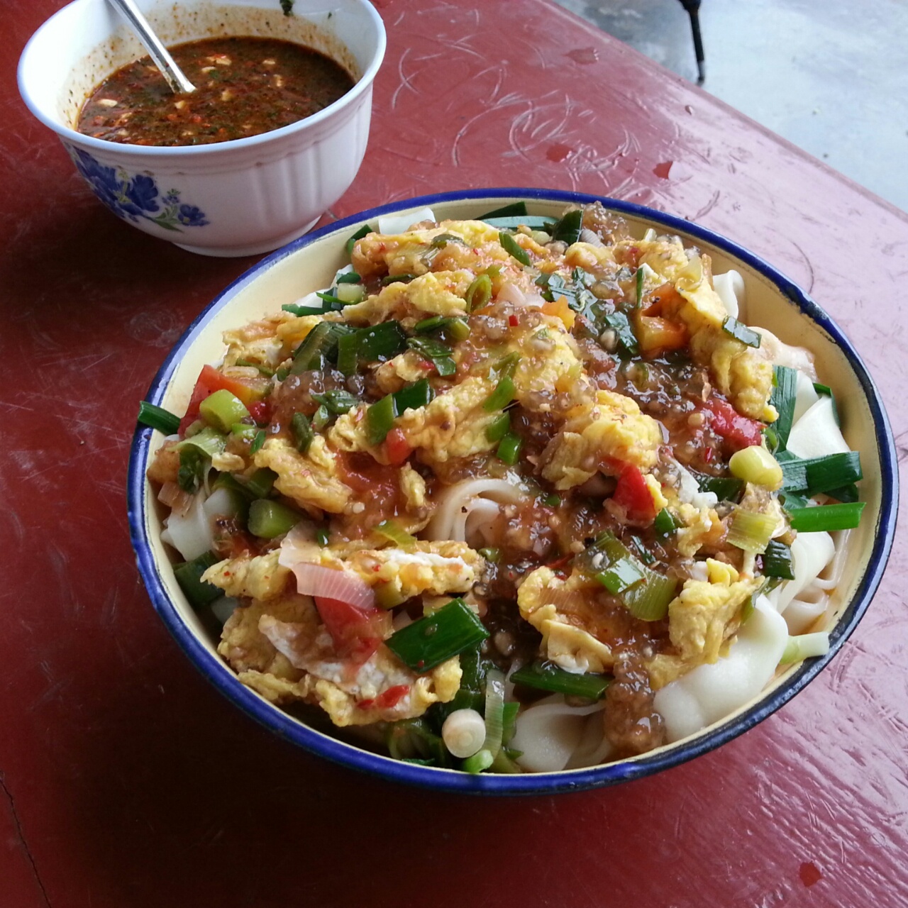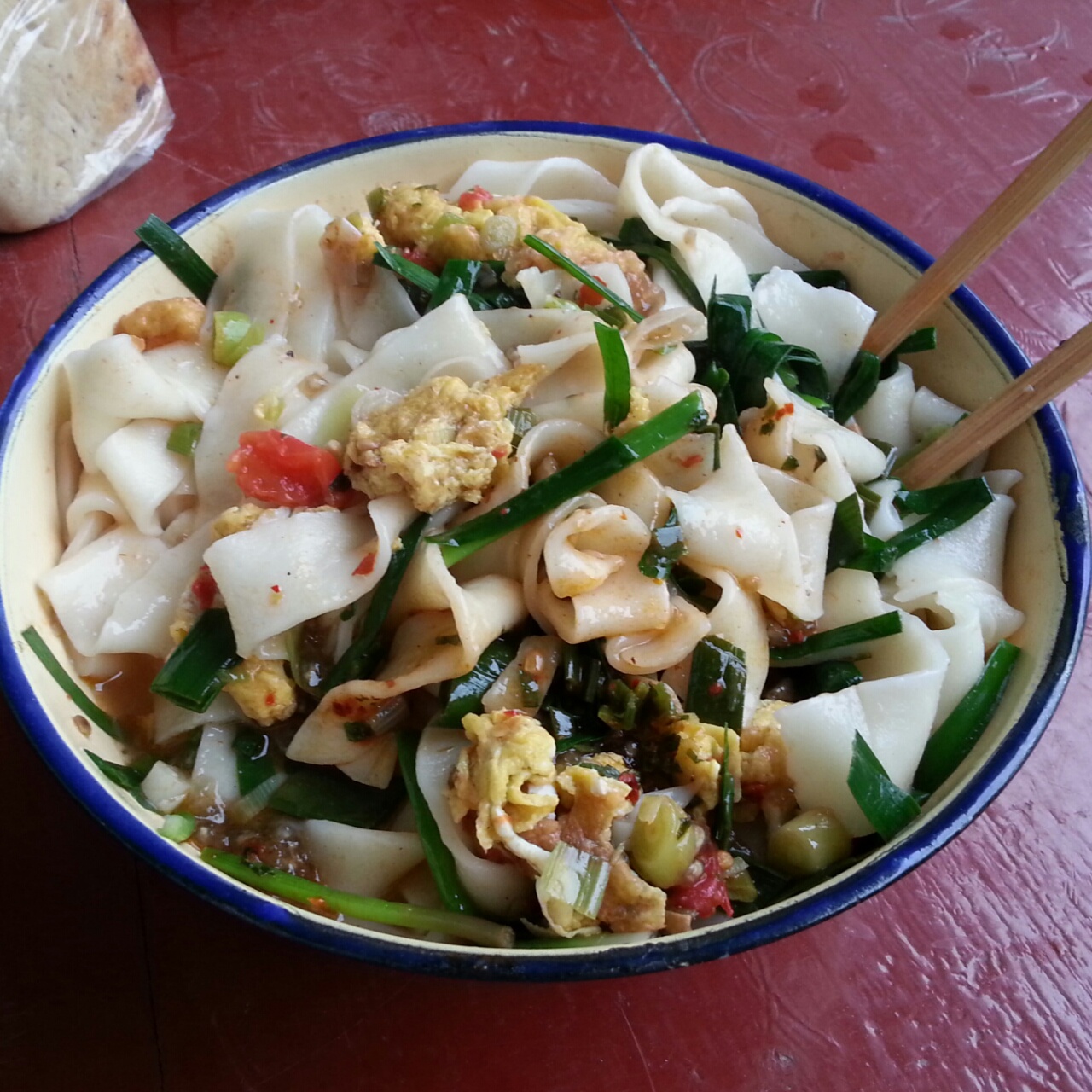 路边民居的大娘手擀面!很好吃,韭菜