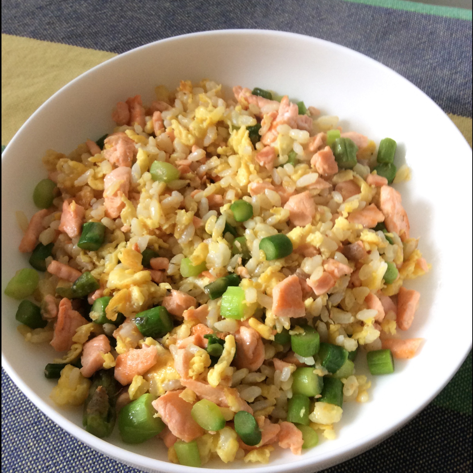 先在米饭里打了一个鸡蛋,再下锅炒干,再下芦笋三文鱼。