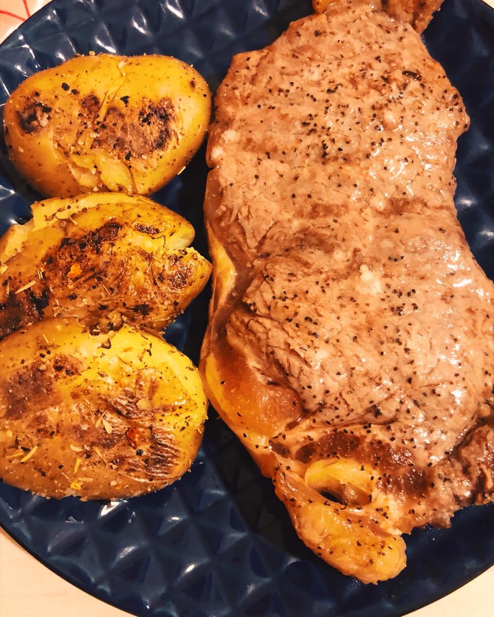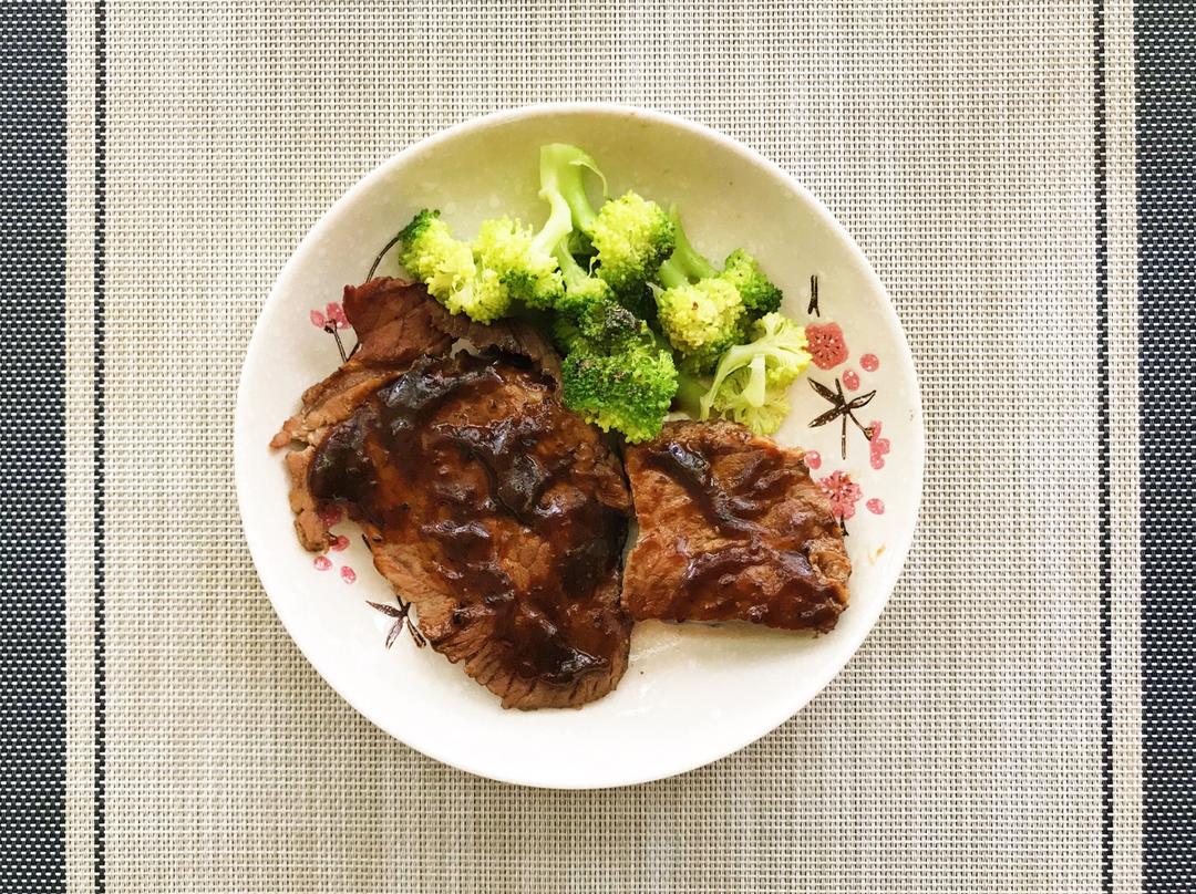 买的烤箱到啦,立刻把冰箱冻了好久的牛排拿出来烤了,搭配几朵西蓝花,看起来可比吃起来好多了😬