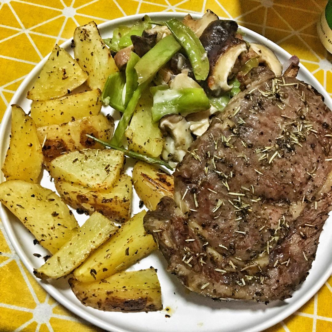 烤牛排,薯角,芝士焗香菇荷兰豆,烤箱真是个好宝宝!