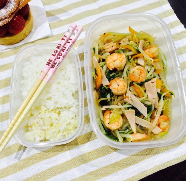 【虾仁火腿炒水菜绿豆芽+燕麦二米饭拼白米饭】