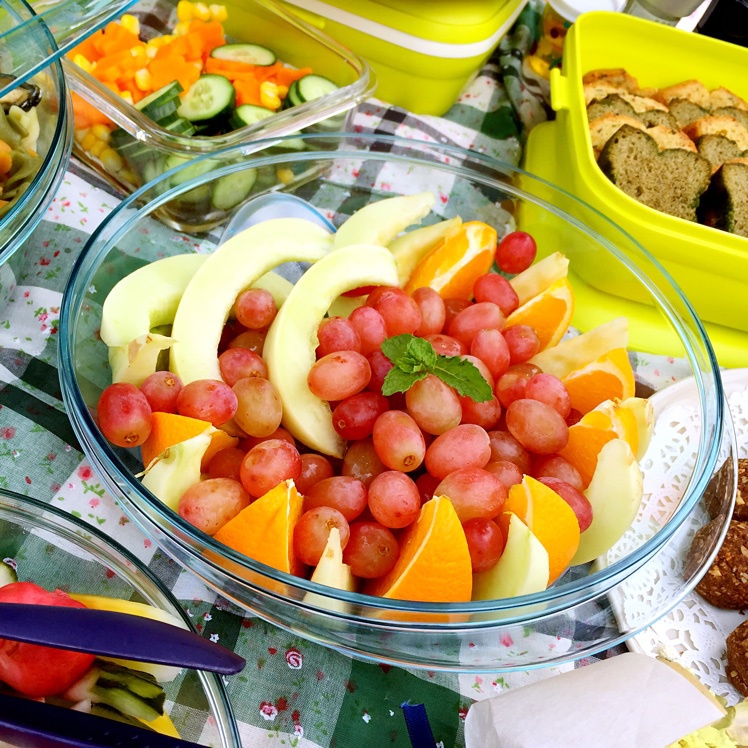 6月7日广州生物岛野餐趴。精选了甜度高的香瓜、脐橙、无籽红提拼了水果盘,盘子太小,放不下太多品种,结...
