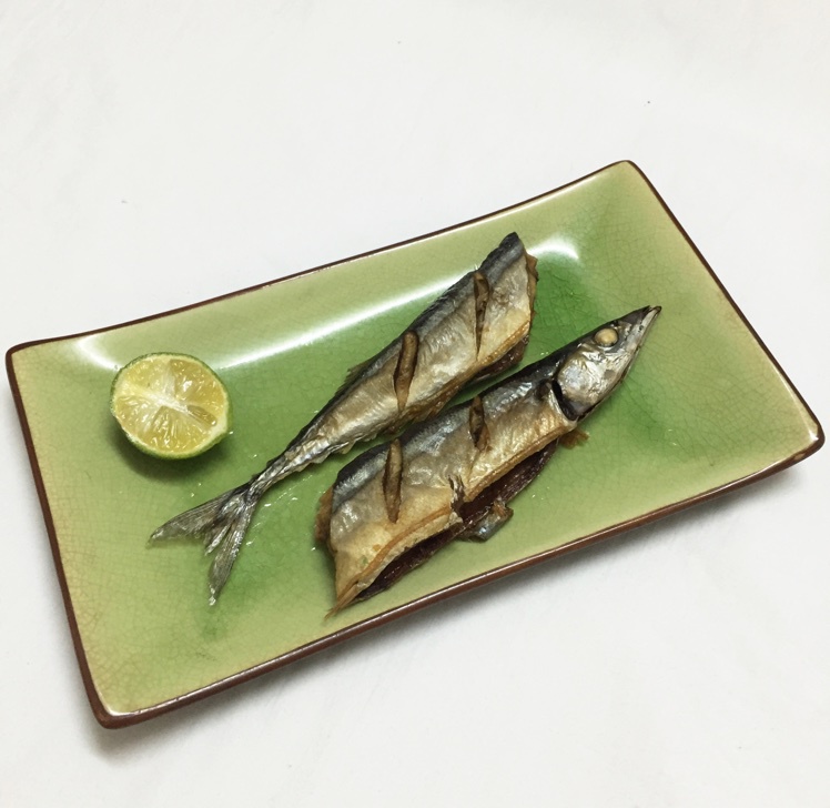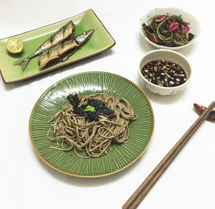 凉拌荞麦面,盐烤秋刀鱼,炒红苋菜