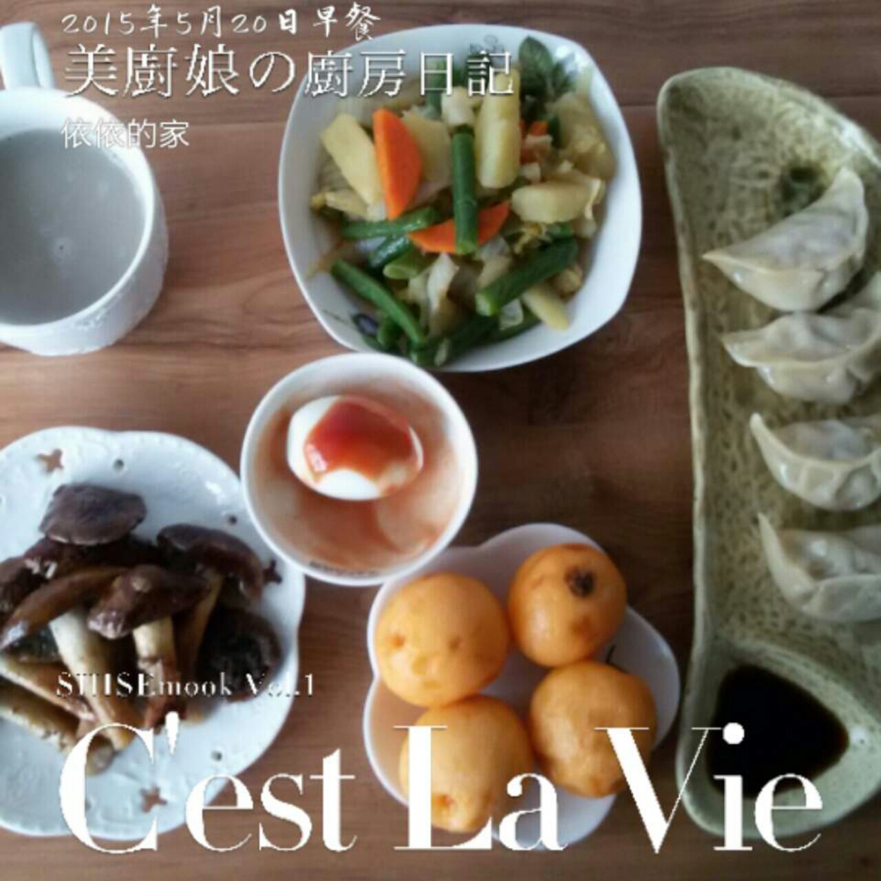 今日早餐:【蒸饺】,【炒杂蔬】,【烤松茸】,【番茄酱^O^白煮蛋】,【枇杷】