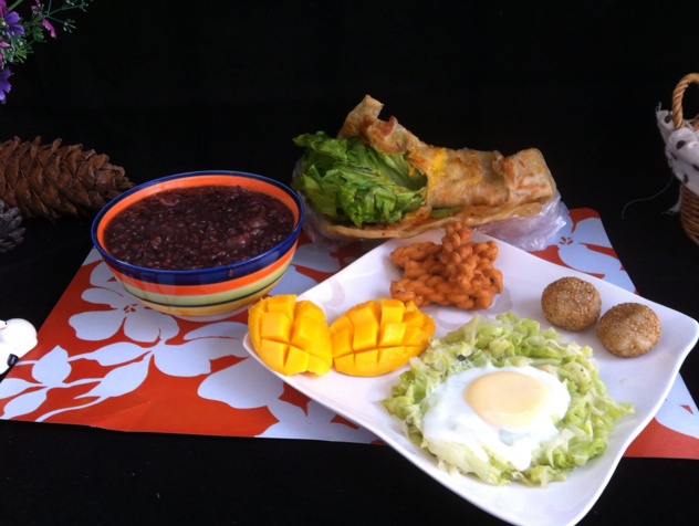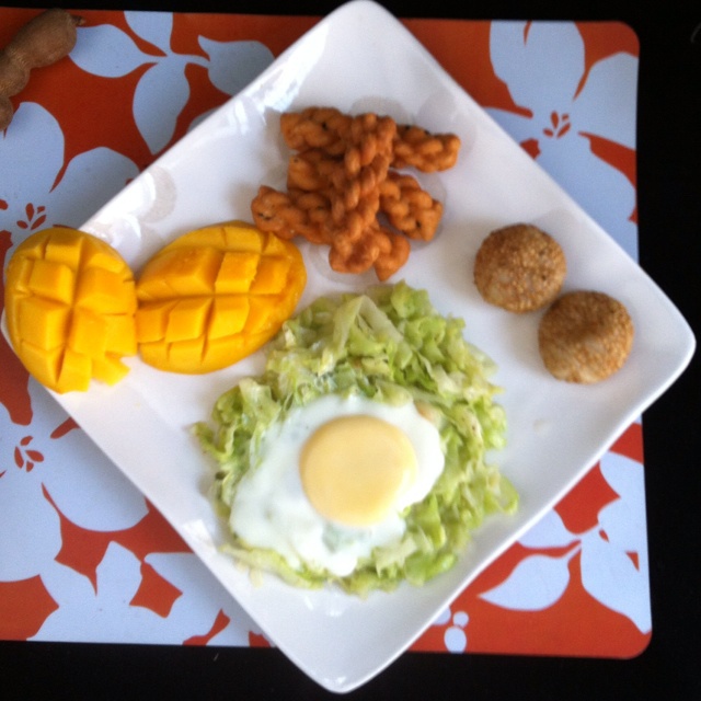 包菜窝蛋,小麻花,麻圆,芒果,鸡蛋灌饼。