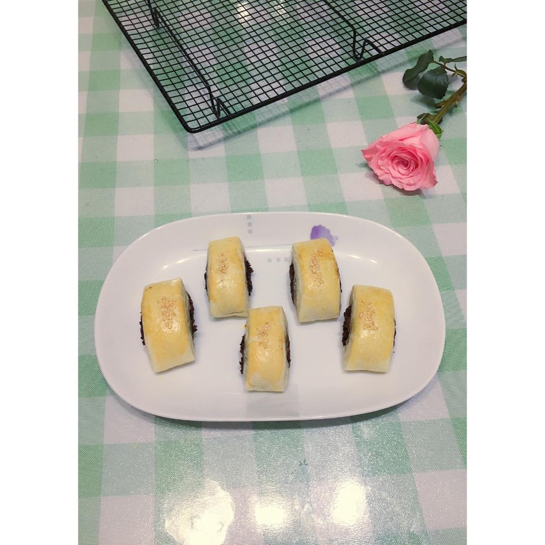 这是失败的作品,油酥太稀了漏酥漏的非常厉害,这里包住那里漏出来,后来勉强包成一长条。烤好后吃了一个,不知道是不是我豆沙放...