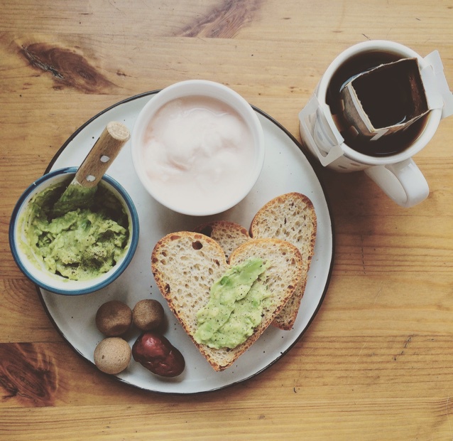 心形奶酪面包(Jackie投喂)、牛油果捣碎了加盐胡椒粉柠檬汁做抹酱、易极优酸奶、挂耳包咖啡、桂圆和...