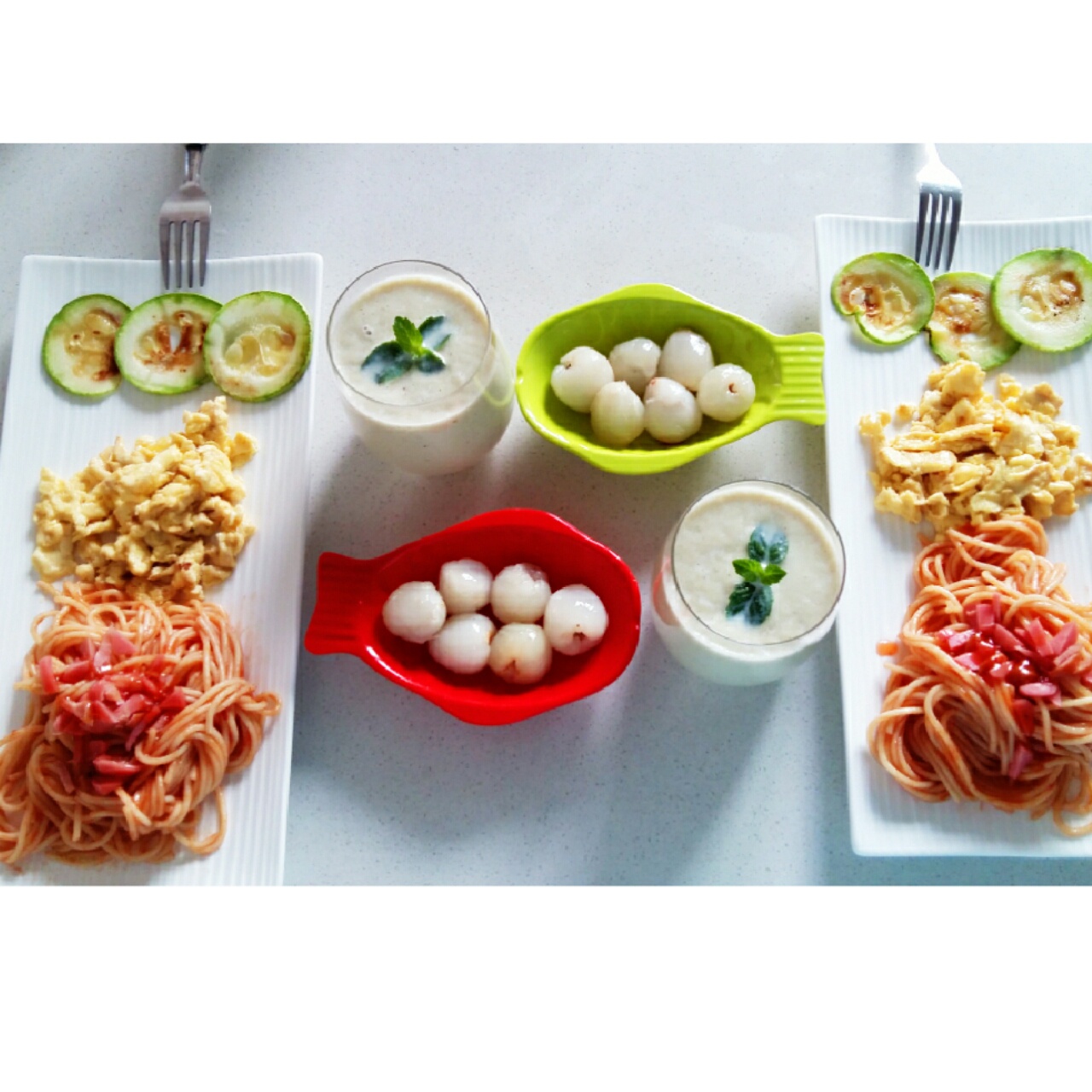 西葫芦火腿意面+鸡蛋+荔枝+牛油果香蕉奶昔