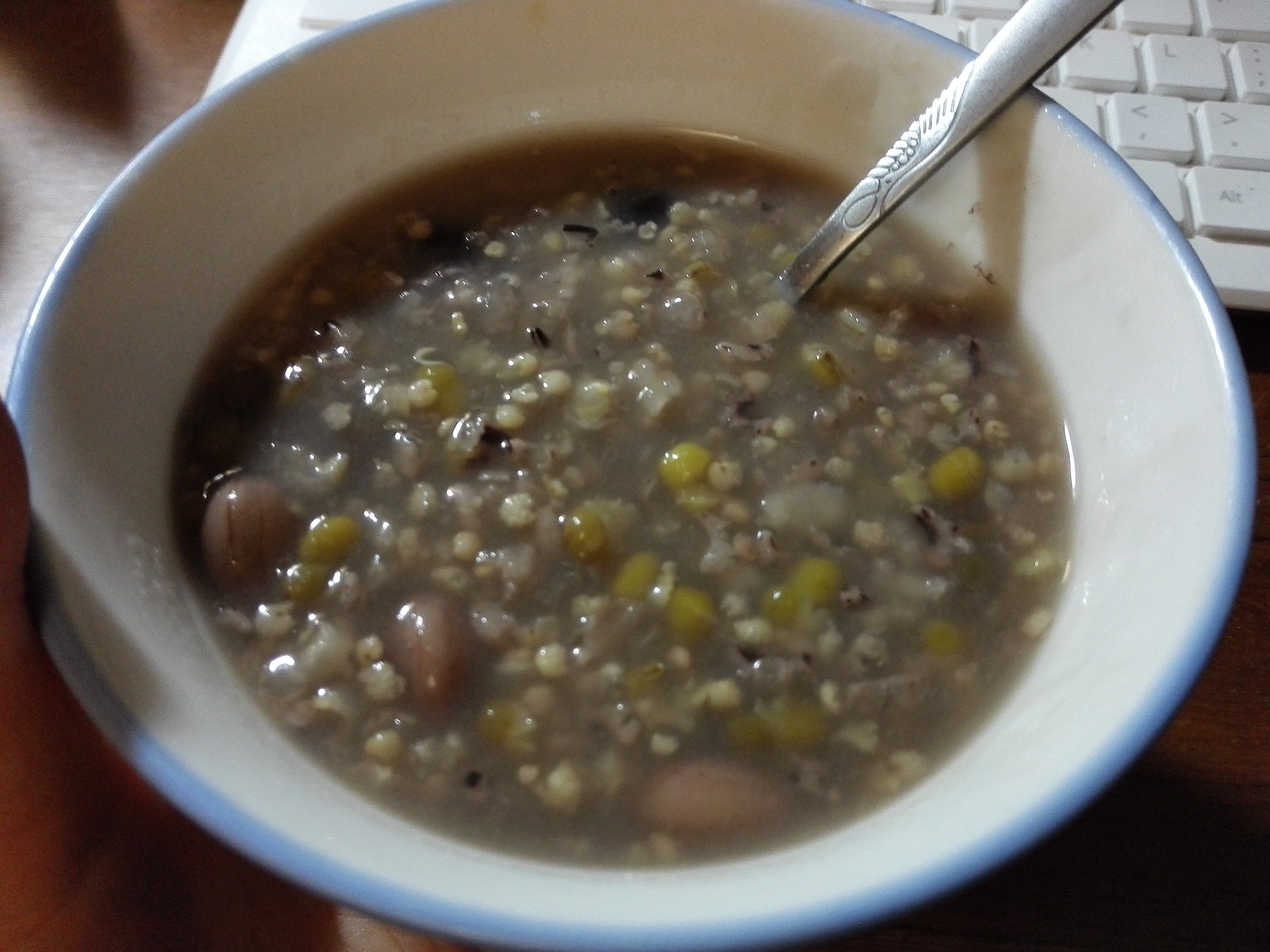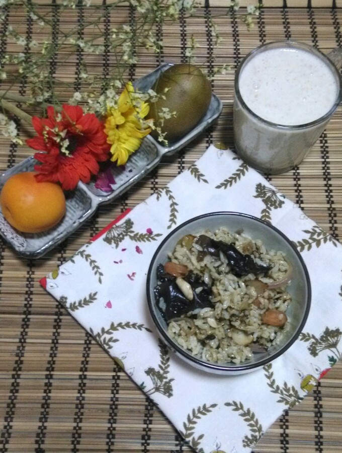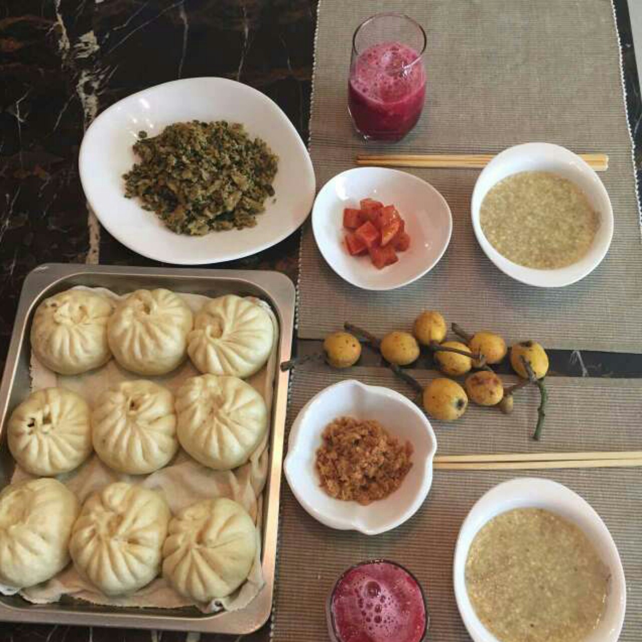 北方豆沙包(豆沙里一滴油没加,反而加了把松子仁儿)藜麦粘玉米粥,香椿芽炒...