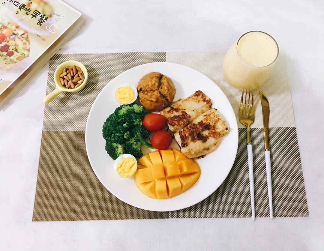 今日早餐:香煎黑椒龙利鱼➕白灼西兰花和鸡蛋➕芒果➕红糖...