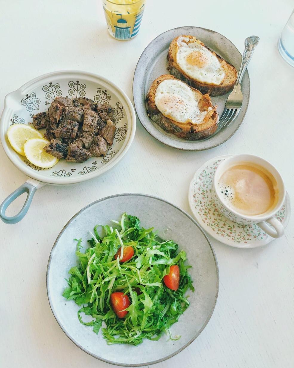 煎牛肉粒、欧包、煎蛋、蔬菜沙拉、我的咖啡孩儿的现打芒果奶昔[胜利]
