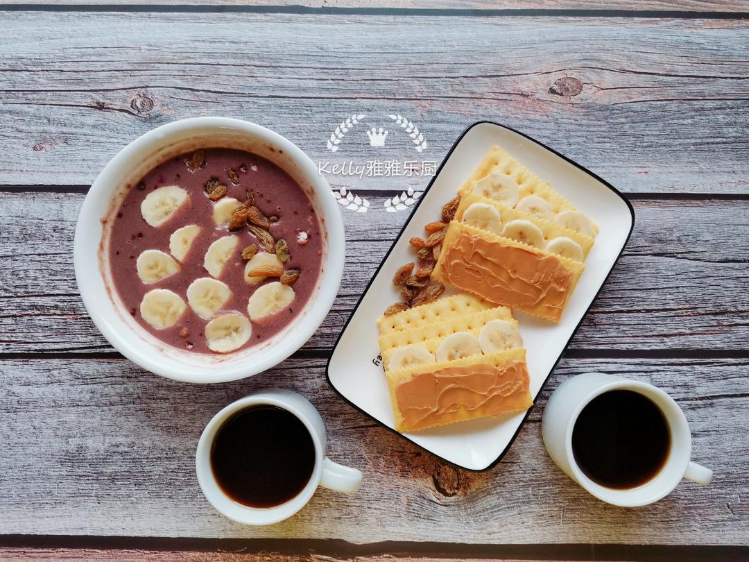 👨:香蕉花生酱夹心苏打饼+咖啡+葡萄干