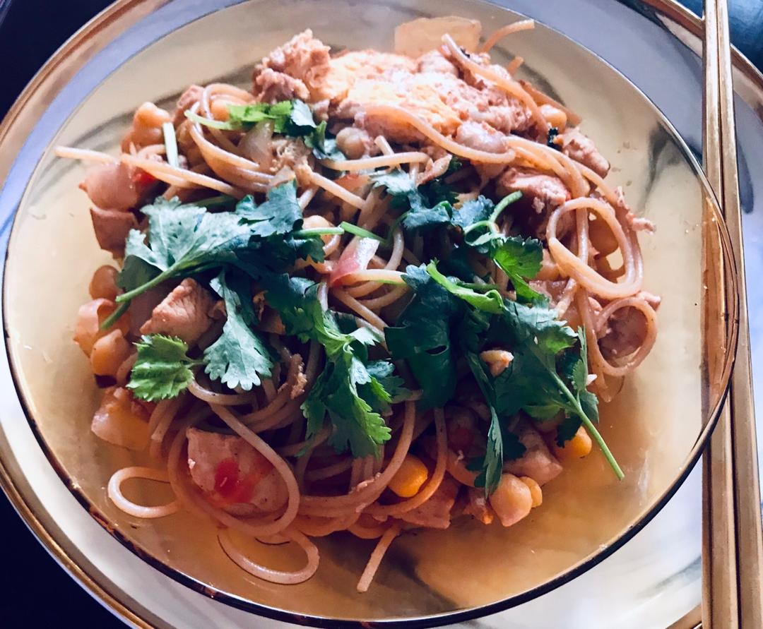 昨晚煮的鹰嘴豆一锅端,今天来个快手一人食:8分钟煮好意面,旁边一锅端加热,拌上熟面条,打个鸡蛋,撒上香菜,美味出锅!#午...