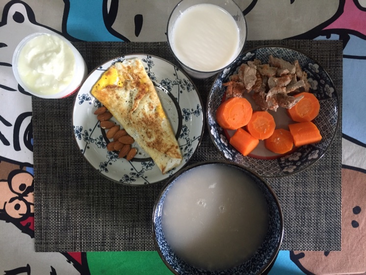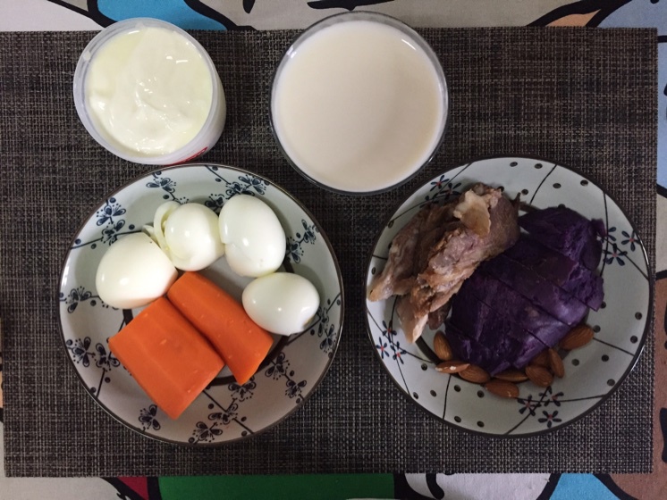 早餐:紫薯200g,牛腱70g,胡萝卜150g,煮蛋清4个,杏仁10g,自制酸奶250g,脱脂牛奶300ml,...