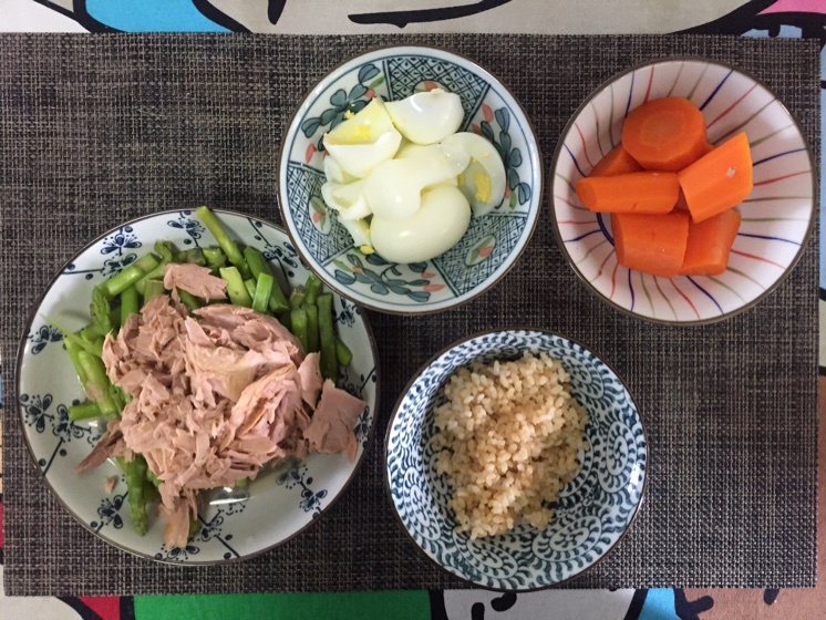 午餐:糙米饭50g,水浸金枪鱼130g,煮蛋清4个,炒芦笋150g,胡萝卜120g,总450卡。
