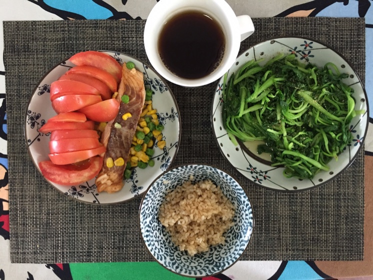 午餐:糙米饭40g,煎三文鱼130g,炒青菜200g,西红柿200g,总550卡。
