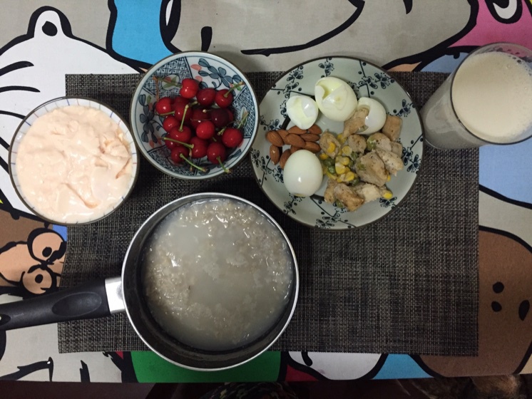 早餐:燕麦片40g,煮蛋清2个全蛋1个,鸡胸100g,杏仁10g,酸奶250g,脱脂牛奶300ml,樱桃若干,...