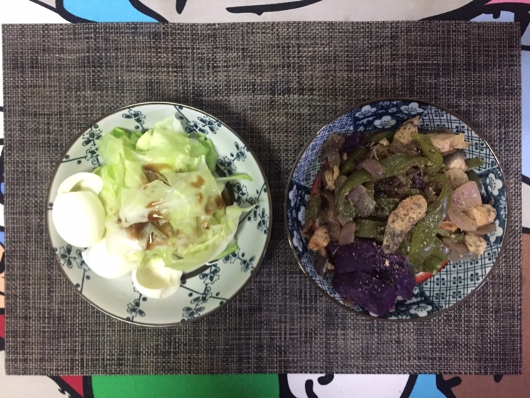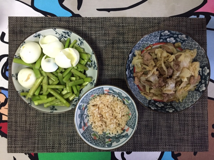 晚餐:糙米饭30g,猪里脊150g炒卷心菜150g,煮蛋清4个,炒芦笋150g,自制...