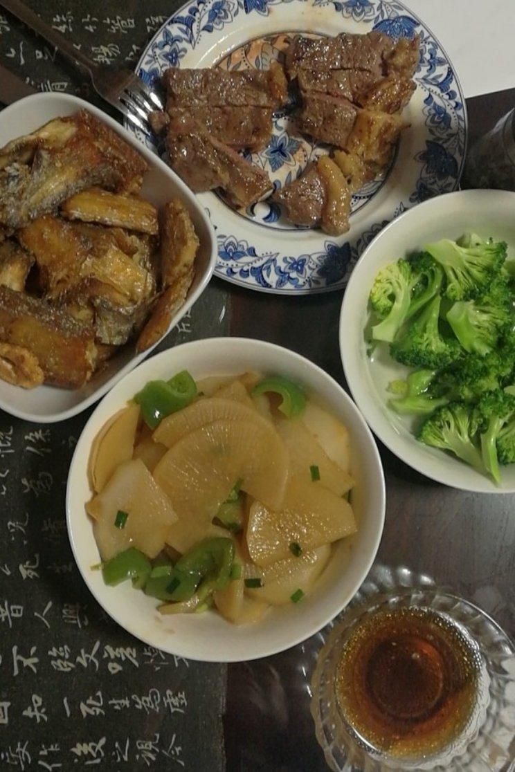 焦香炒牛肉,红烧白萝卜,还拌了黄瓜豆皮凉菜,酸菜炒肉粉丝,凉菜酸菜没有拍照,着急吃饭忘...