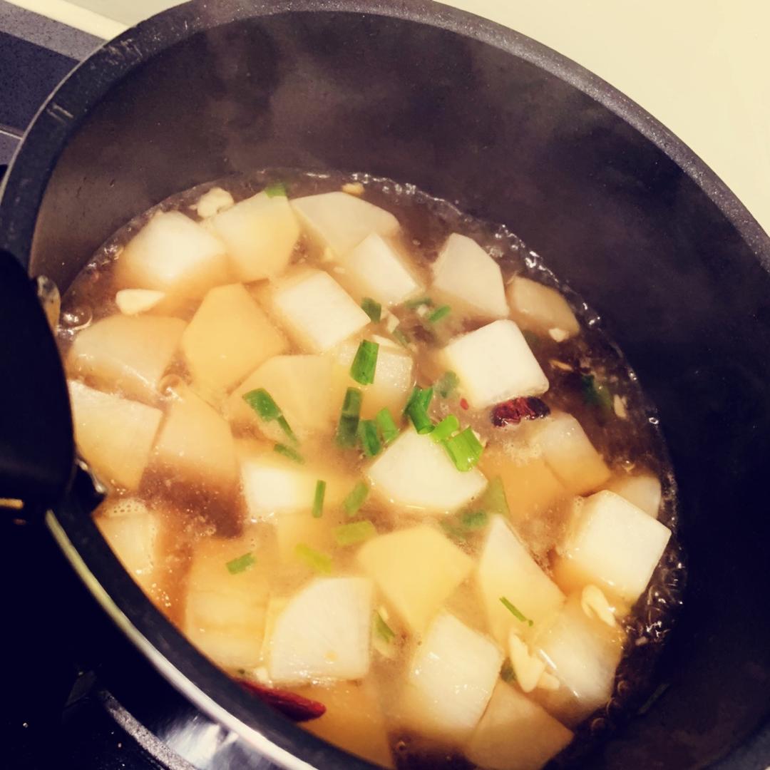 第一次尝试红烧萝卜,太好吃了,萝卜放多了一些,于是加了三勺生抽,三勺糖,味道超级好,加上青蒜和葱出锅好香啊!#晚餐•20...