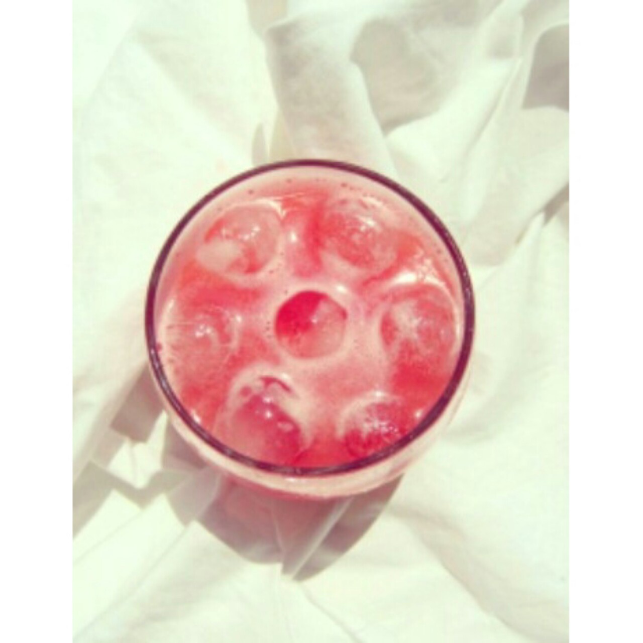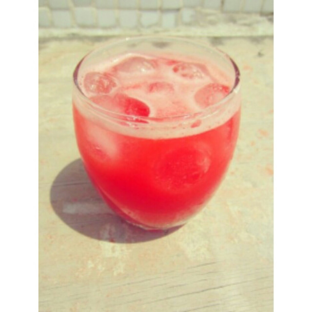 西瓜汁,放了圆圆的冰块感觉挺可爱,炒鸡凉爽~ (请忽略那块长着好多雀斑的木板)
