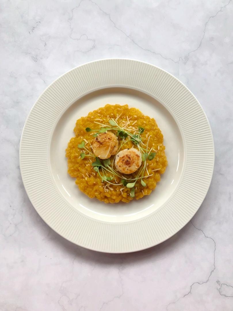 南瓜做的黄金烩饭 配上两颗大带子好吃,很香甜,完美