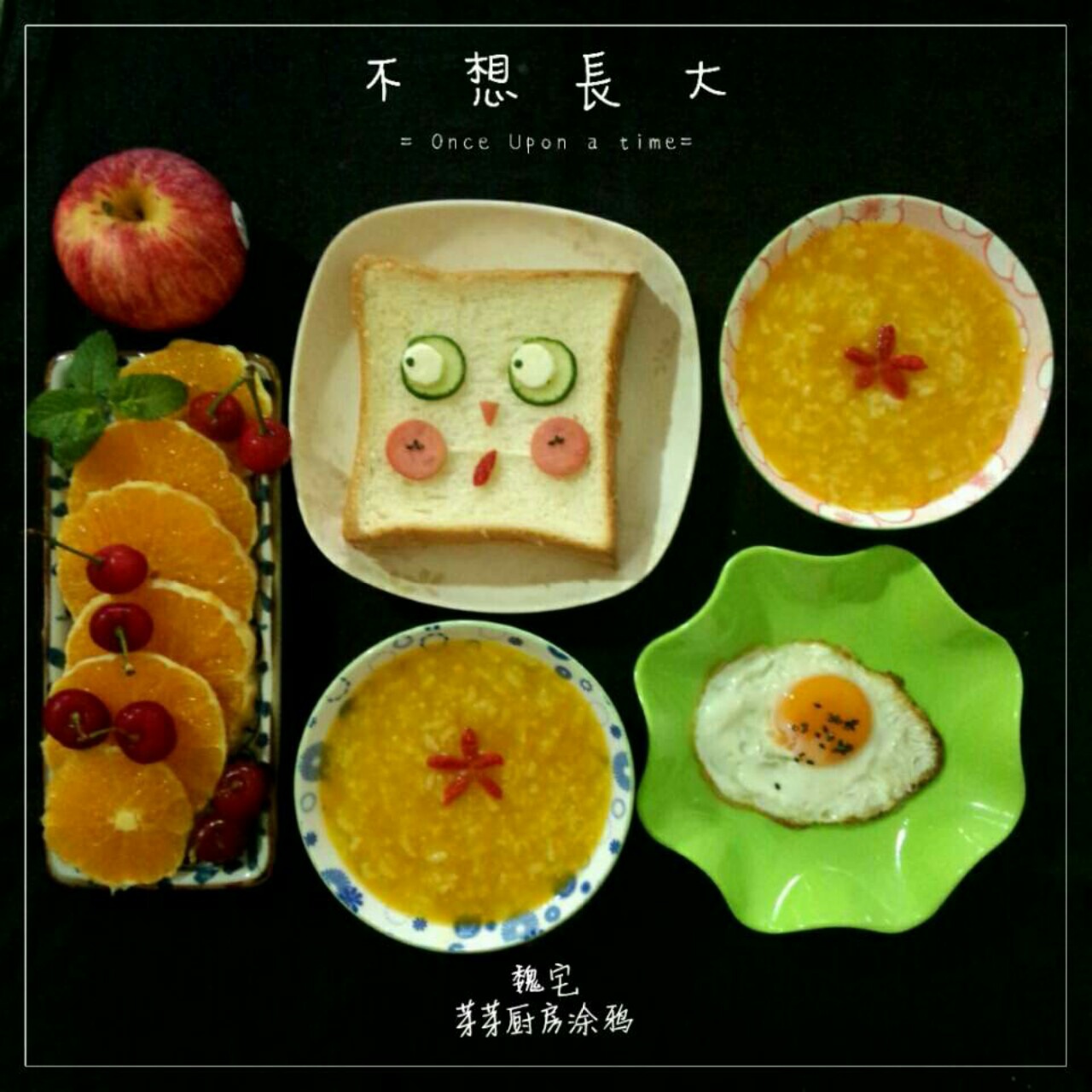 南瓜糯米粥,海绵宝宝三明治,煎鸡蛋,橙子,樱桃!...