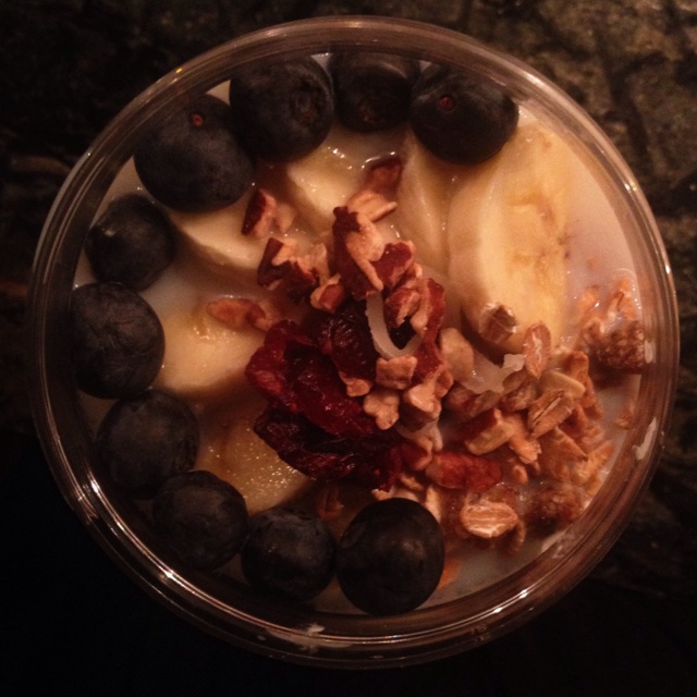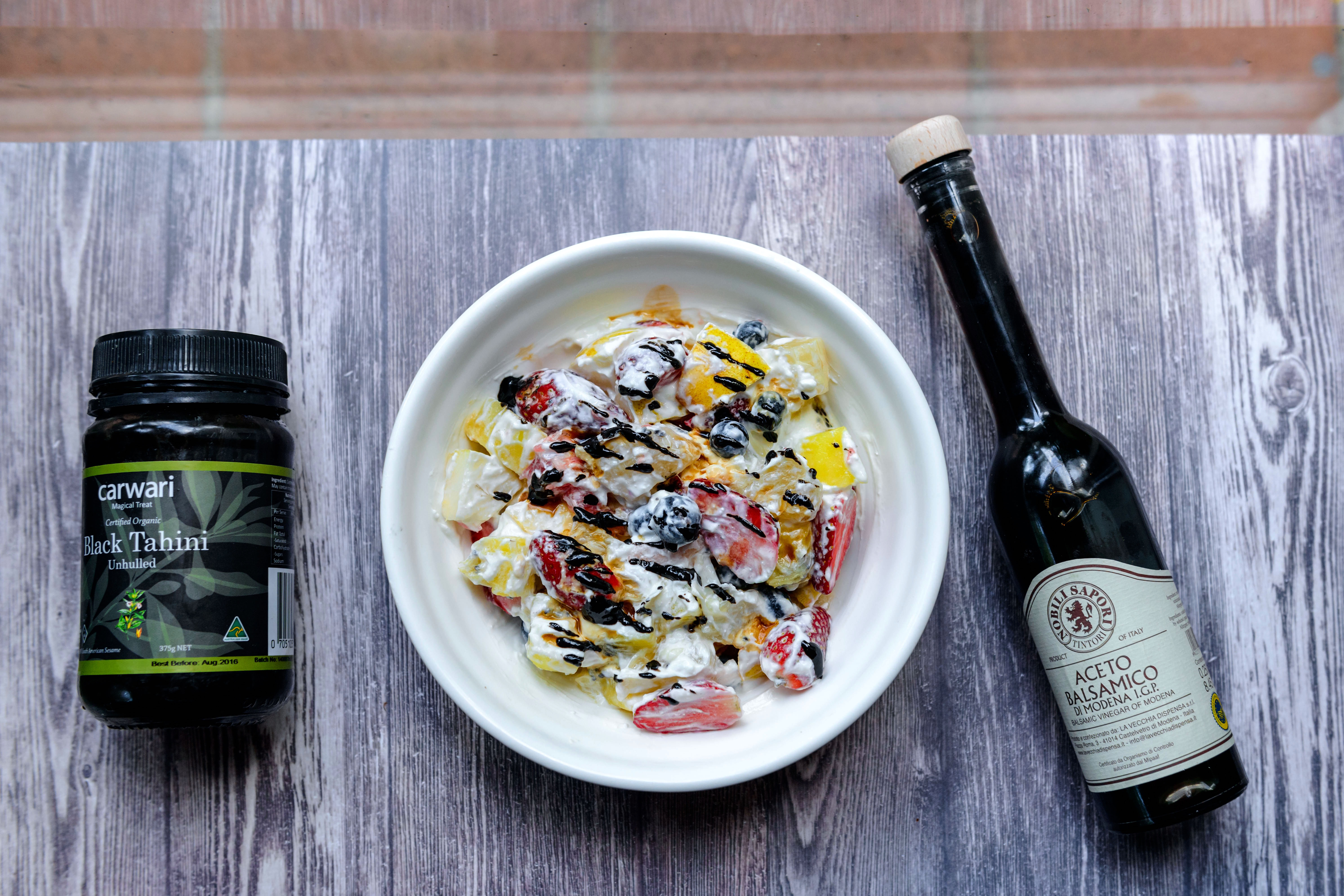 水果色拉,酸奶拌过了以后加上新买的六年陈balsamico和黑芝麻酱。