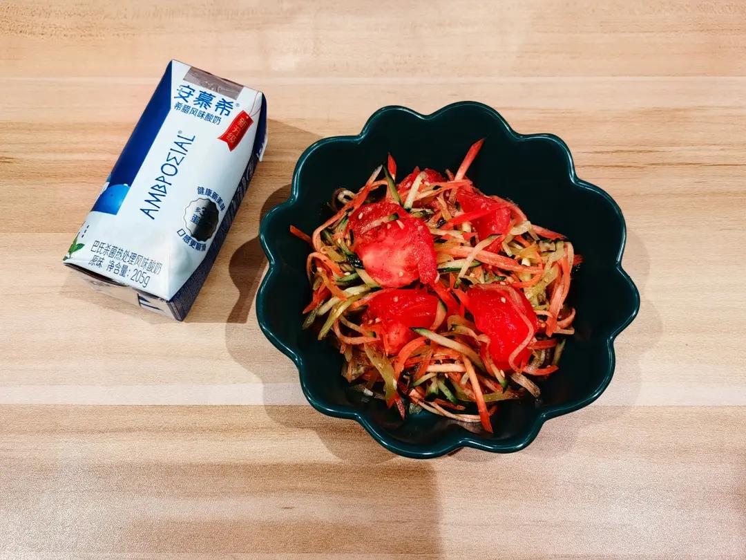 莴笋丝,黄瓜丝,红萝卜丝,西红柿大拌菜,酸奶!