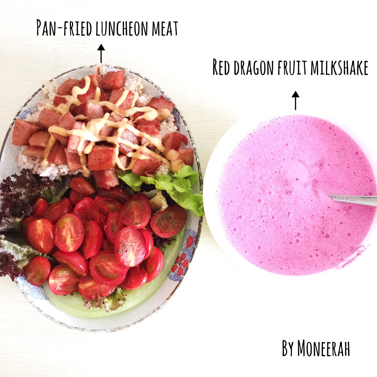 早啊 千岛酱午餐肉饭+火龙果奶昔 好丰盛 分分钟光盘 每一样都太好吃 我这英语 也是够了……可是就是喜欢这些字体……请大...