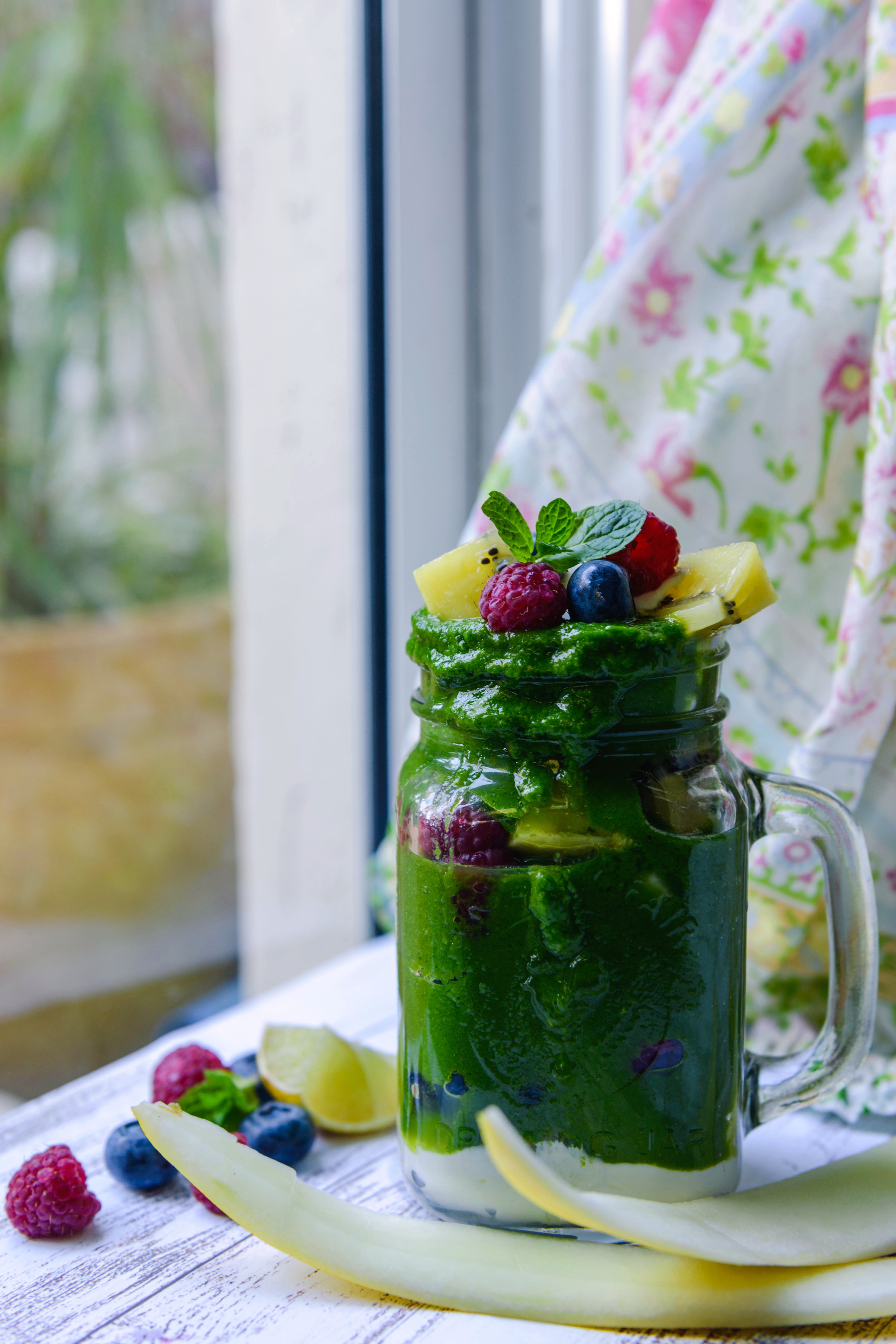 kale+甜瓜+冻香蕉+冻葡萄,金奇异果和昨天做的酸奶。酸奶失败了加种子重来放的时间...
