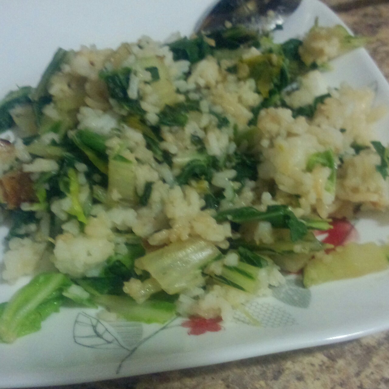 只有菜叶和饭,一瓣蒜。