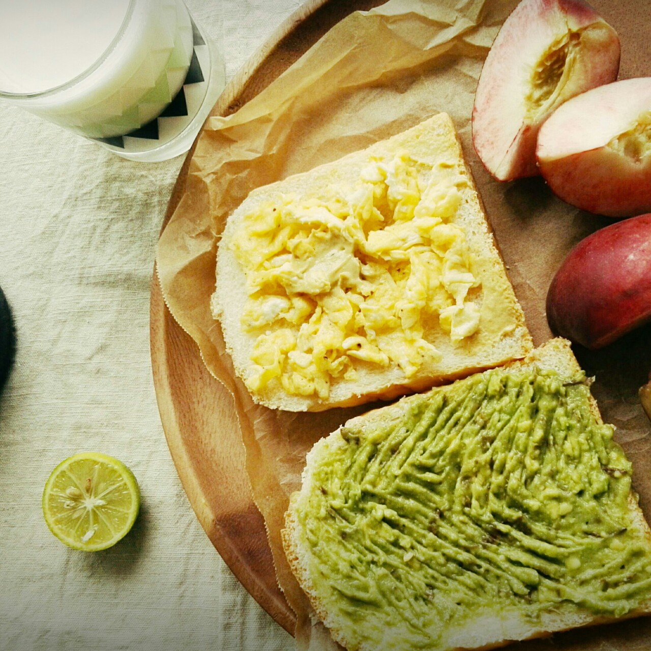 早餐日記0629~終於自己也能吃上北海道吐司了/::B,給朋友帶走一個,留個自己解饞,配了美式炒蛋和牛油果醬,一杯熱牛奶...