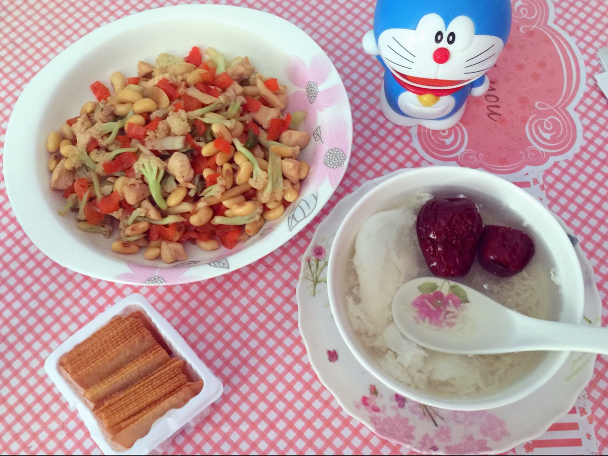 红枣酒酿蛋,鸡丁黄豆炒时蔬。一直想做创新菜,可惜了冰箱里的库存,扔掉可惜,不扔看着心烦,还是做个持家女汉子吧,各种混合各...