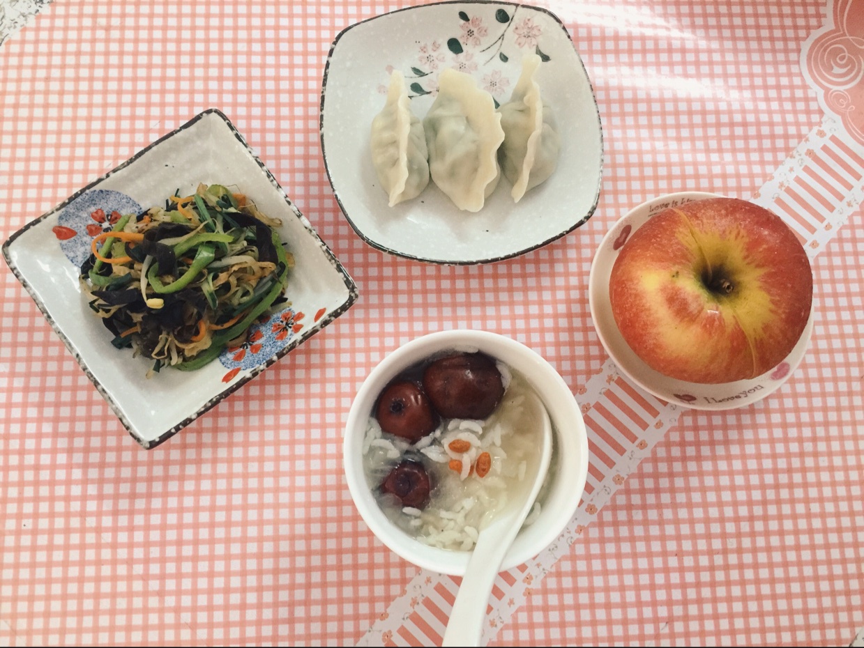 元气早餐:素炒时蔬,虾仁水饺,银耳汤,大苹果哈哈