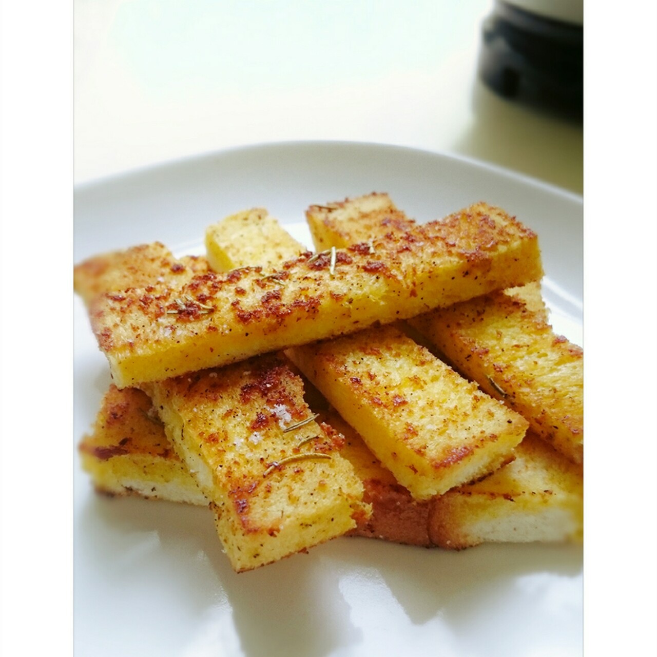 没有香葱没有芝麻的"香葱芝麻吐司条"…迷迭香蒜蓉黑胡椒一样好味,最关键我连烤箱都没开偷懒直接用平底锅煎的...