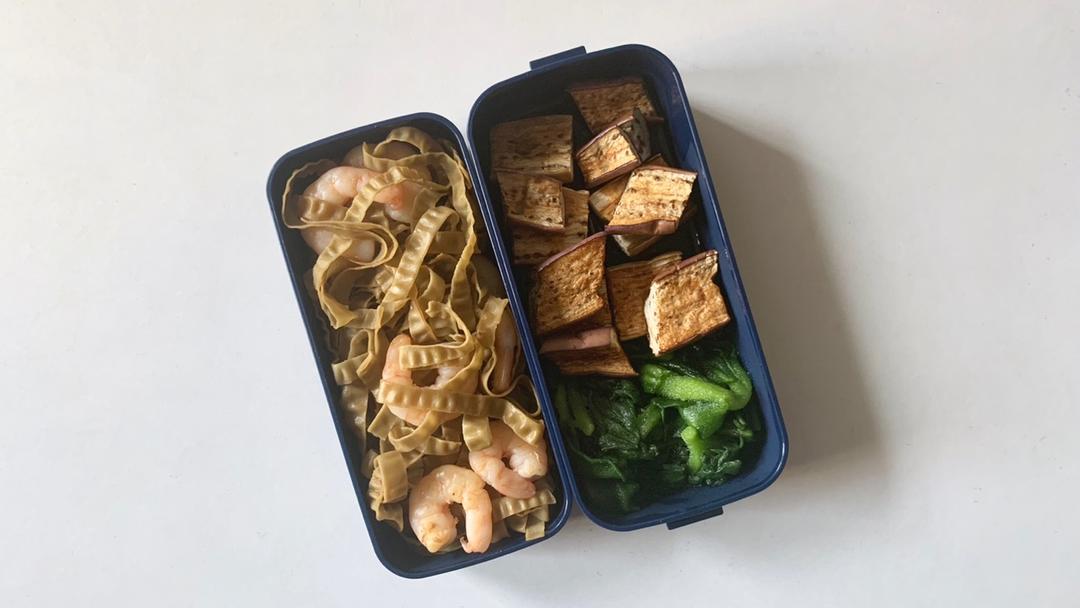 青菜+烤双色茄子+虾仁炒扁豆宽意面