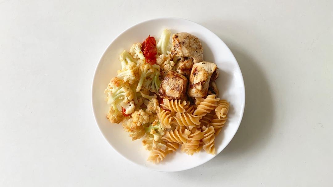 番茄炒花菜+鸡胸肉+扁豆意面