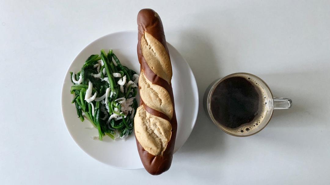 黑咖啡+碱水面包+油麦菜拌银鱼
