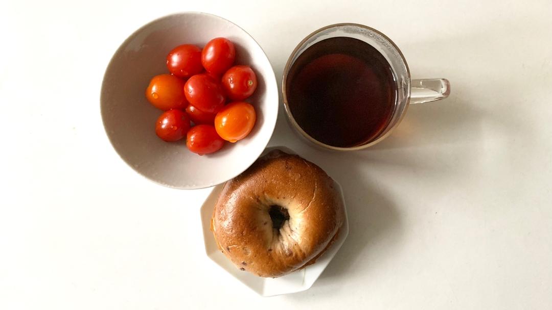 黑咖啡+贝果抹杏仁酱+樱桃番茄