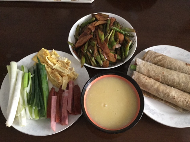 杂粮煎饼卷配杏鲍菇炒芦笋玉米面糊糊。