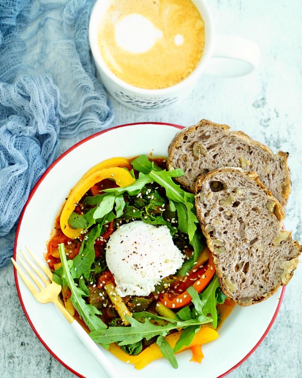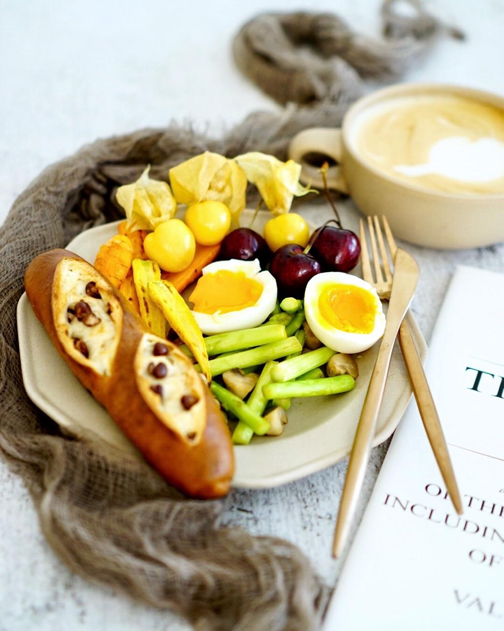 红豆碱水包,芦笋炒蘑菇,溏心蛋,烤胡萝卜,水果,卡布