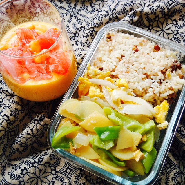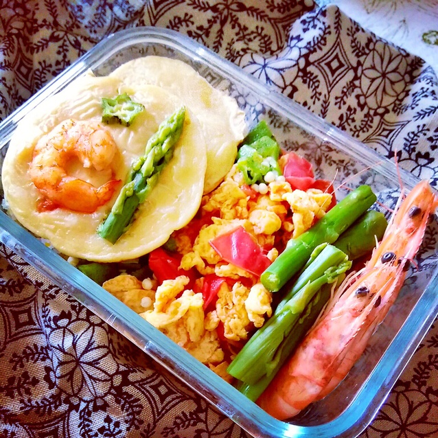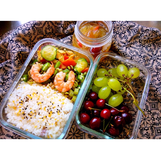 小松饼下面是杂粮米饭,因为饭很少,所以带了两个小饼呐~还有煮大虾,清焯芦笋,番茄鸡蛋。