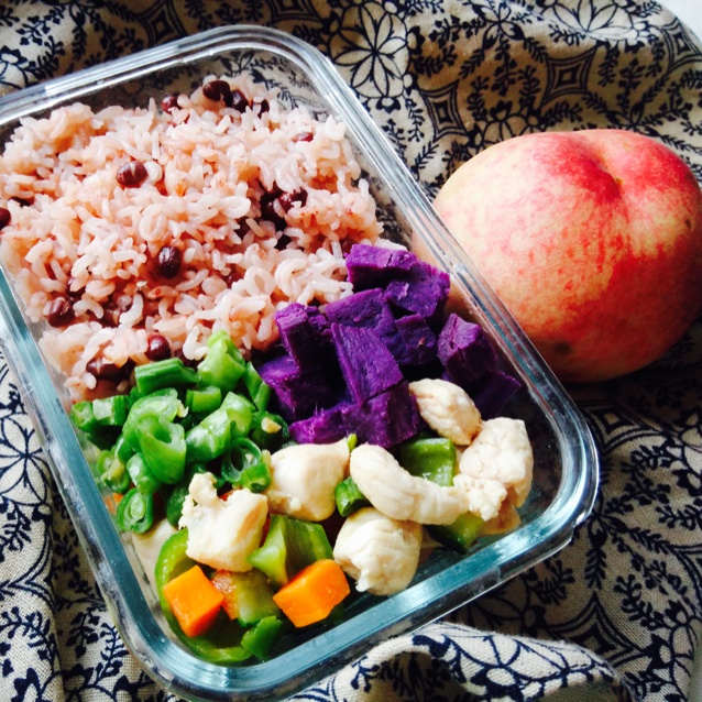 红豆焖米饭,炒豆角,什锦鸡丁,蒸紫薯,桃子。