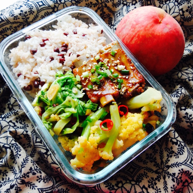 红豆焖米饭,炝炒圆白菜,干锅菜花,糖醋小排,桃子。