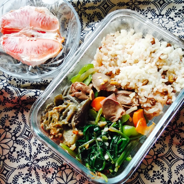 绿豆焖米饭,尖椒胡萝卜鸡心,麻酱茄泥,糖醋拌菠菜,半颗西柚。