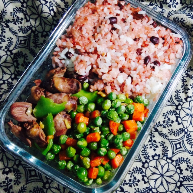 红豆米饭,尖椒炒鸡心,胡萝卜炒豌豆。
